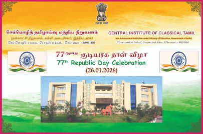 செம்மொழித் தமிழாய்வு மத்திய நிறுவனத்தில் இன்று (26.01.2026) நடைபெற்ற நாட்டின் 77வது குடியரசு நாள் விழாவில், இயக்குநர் பேராசிரியர் இரா. சந்திரசேகரன் அவர்கள் தேசியக் கொடியை ஏற்றிவைத்துச் சிறப்புரையாற்றினார். பதிவாளர் முனைவர் ரெ. புவனேஸ்வரி அவர்கள் வாழ்த்துரை வழங்கினார்.