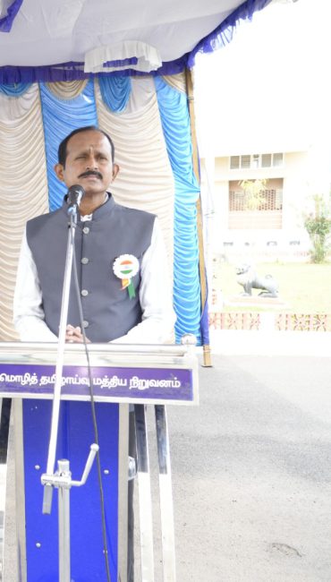 பேரா. இரா. சந்திரசேகரன் அவர்கள் தேசியக் கொடியினை ஏற்றிவைத்துத் தலைமையுரை ஆற்றினார். நிறுவனப் பதிவாளர் முனைவர் ரெ. புவனேஸ்வரி அவர்கள் வாழ்த்துரை வழங்கினார்.