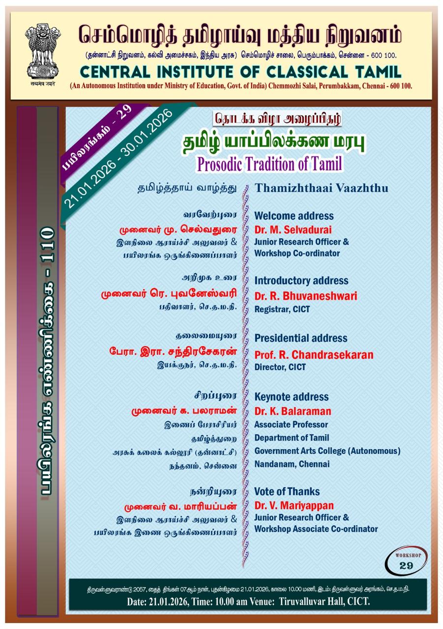மத்தியக் கல்வி அமைச்சர் திரு. தர்மேந்திர பிரதான் அவர்கள் இன்று (06.01.2026) டெல்லியில் நடைபெற்ற விழாவில் செம்மொழித் தமிழாய்வு மத்திய நிறுவனத்தின் 13 புதிய நூல்களை (புறநானூறு, பதிற்றுப்பத்து, பத்துப்பாட்டு, நான்மணிக்கடிகை, நானாற்பது, முத்தொள்ளாயிரம் (மலையாள மொழிபெயர்ப்பு) சிலப்பதிலாரம் (தெலுங்கு மொழிபெயர்ப்பு) தமிழ்நாட்டில் இராமர் திருக்கோயில்கள் (தமிழ் & இந்தி மொழிபெயர்ப்பு), தமிழ்நாட்டு மரச் சிற்பங்கள், சங்க இலக்கிய அகராதி, அகநானூற்று அகரமுதலி- வினைச்சொற்கள், அகநானூற்று அகரமுதலி - பெயர்ச்சொற்கள்)