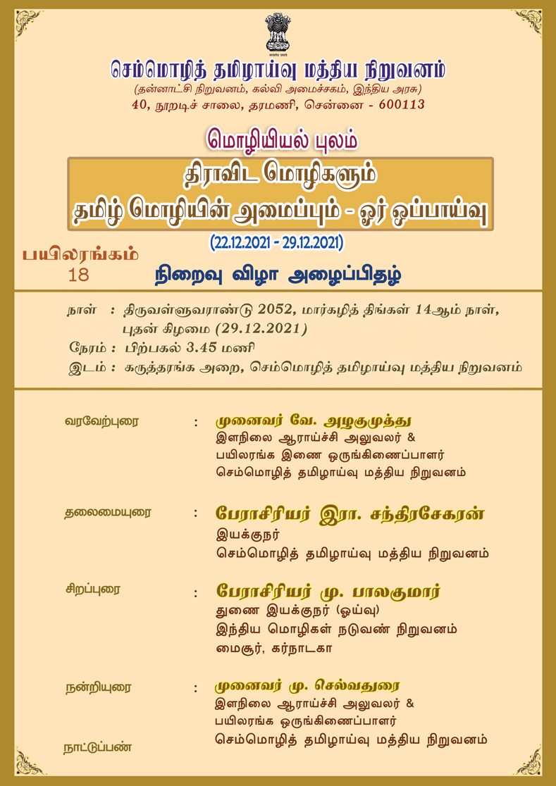 திராவிட மொழிகளில் தமிழ் இலக்கணக் கூறுகள் - பயிலரங்க நிறைவு விழா அழைப்பிதழ்